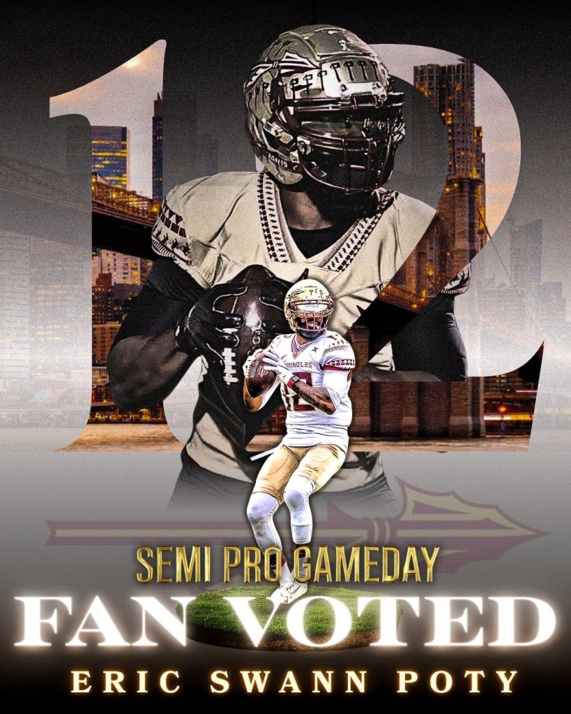 The Family Line giving a big shoutout to cuz Jerol ‘G-Block’ Wilson, quarterback of the Brooklyn Seminoles, for winning the SemiPro GameDay Fan Vote as the Eric Swann National Player of the Year. He led with 37% of the votes while the runner-up got 25%. ‘Coach C’ and the team sent props too on making history.