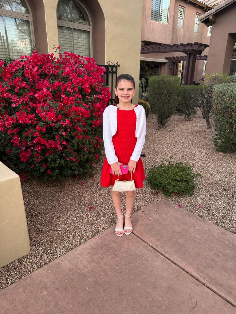 Look who’s all dressed up and ready for the school dance? Yes, now that she’s in the ‘teenage league’, Sara is all-in for the Valentine’s affair. Rumor is that a secret admirer boy…friend, locked-in for a dance with her, days before the event. Well, she’s all smiles and the red dressing is ‘redding!’