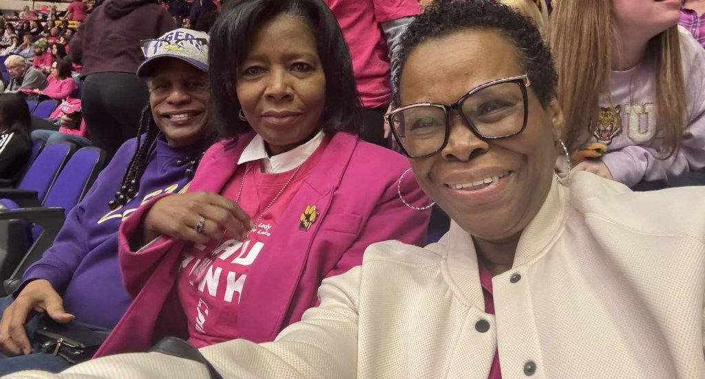 With the NFL season in the rearview, how about checking out a basketball game? Well, that’s exactly what cuz Terri, husband Norman and sister Shellie had in mind. Here they are at a recent LSU Lady Tigers game.